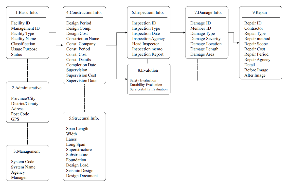 옹벽, 지하차도 등 도로시설물별 부재를 체계적으로 분류하고, 각 부재에 대한 표준화된 속성을 정의하였다. 이어서 관계형 데이터베이스를 기반으로, 기본정보–행정정보–구조정보–점검정보–손상정보–보수보강–평가등급