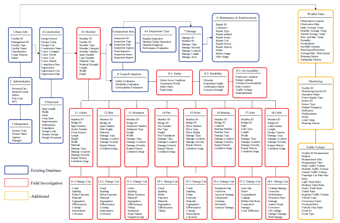 이에 본 연구에서는 기존 시설물 단위 관리체계의 한계를 극복하고, 부재 단위까지 세분화된 관리가 가능한 데이터베이스를 구축하였다. 먼저 교량, 터널,