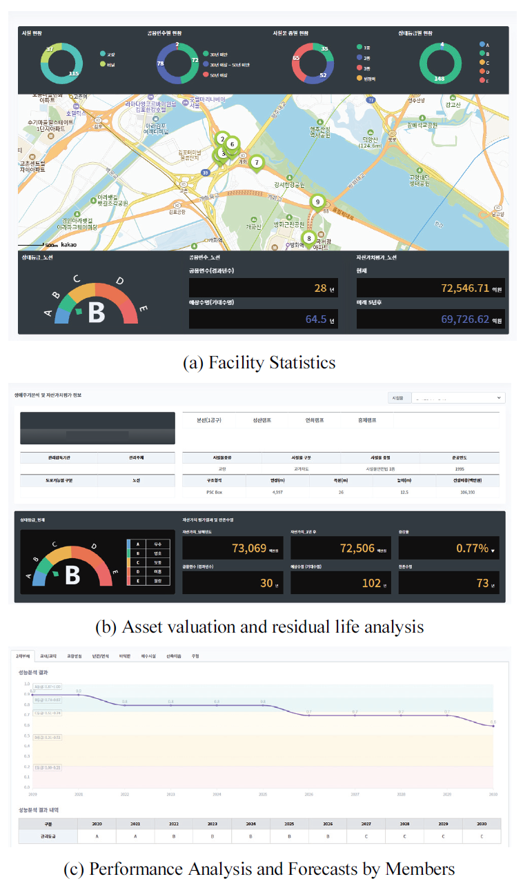 Fig. 4는 이러한 설계를 바탕으로 제안된 DB 기반의 플랫폼 UI 구현 사례로, (a) 시설물 통계 현황, (b) 자산 가치 및 잔존 수명 분석, (c)