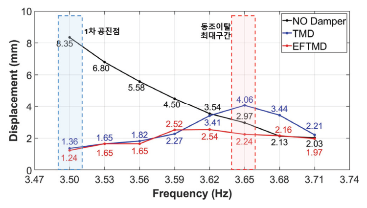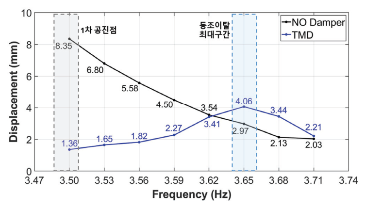 2) TMD 적용 시 동조이탈이 최대로 발생하는 3.65 Hz 조건에서는 최대변위가 4.06 mm로 증가하여, 제어장치가 없는 비제어 상태의 2.97