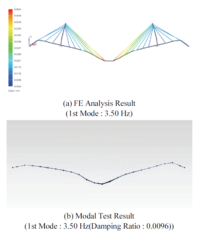 조건으로 모델링 하였다. FE 구조해석 결과 Fig. 3(a)와 같이 대상 구조물의 1차 고유진동수는 3.50 Hz로 산정되었으며, 모달 시험 결과 또한 Fig. 3(b)와 같이 1차 고유진동수는 3.50 Hz(Damping ratio : 0.0096)로 나타나 두 결과가 서로 일치함을 확인하였다.
