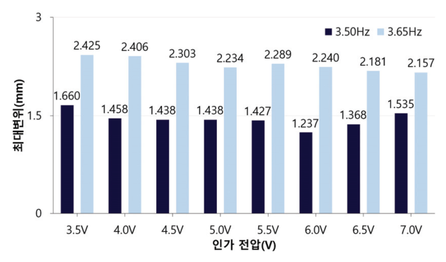 경향을 나타냈으며, 3.65 Hz에서는 최대변위가 4.06 mm에 이르러 비제어 상태의 2.97 mm보다 약 36.70% 크게 나타났다. 이는 TMD가