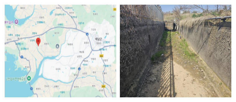 열화된 농수로에서 실시하였다. 2025년 4월 중순, 14:00에 실험이 진행되었으며, 당일 최고 기온은 21℃, 평균 기온은 14℃이었다.