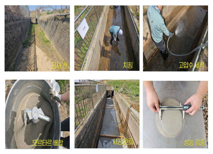 고압 세척 후, 바닥에 물이 고여 있는 상태에서 보수 공정을 시행하였다. 1.7 m × 10 m의 농수로 바닥면에 공정이 진행되었고, 시공이 완료된