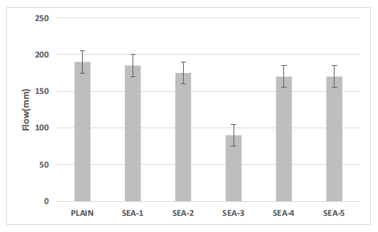 또한, pH 측정 결과 습윤 대응형 혼화제 첨가에 따라 낮아지는 경향을 나타내고 있으며, 이는 배합 시 습윤 대응형 혼화제를 외할 첨가하였기 때문에