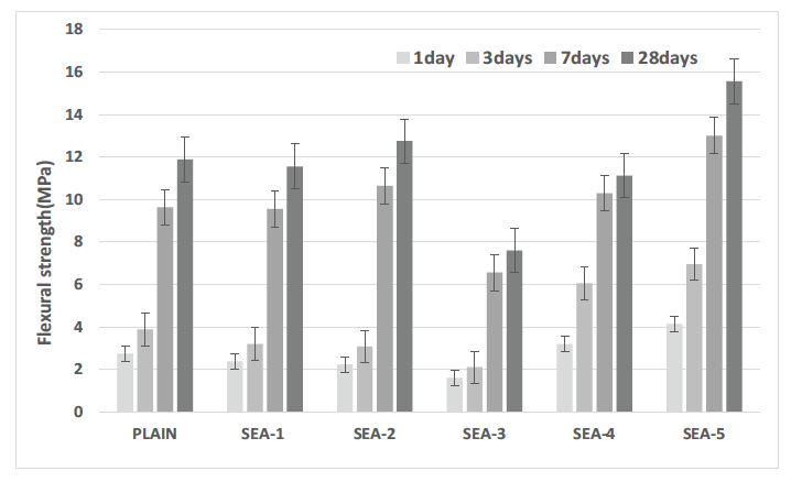1) 기능성 결합재인 고로슬래그 미분말, 표면 개질 실리카퓸(SMF)를 혼입한 SEA-5의 경우 압축강도 55.2 MPa, 휨강도 15.56 MPa,,