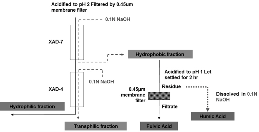 XAD-7수지와 XAD-4수지에 의해 분리된다. pH 2의 조건에서 hydrophobic acid는 XAD-7수지에 흡착이 일어나며 hydrophilic