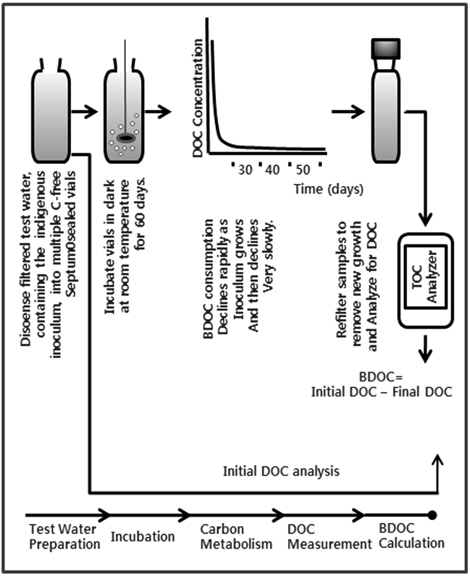 Schematic of BDOC (Biodegradable Dissolved Organic Matters) analysis.