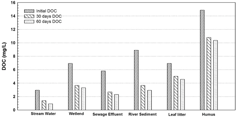 또한, 토양기원의 용존 유기물에서는 10~50%의 낮은 생분해율을 보이는 반면, 휴믹화가 덜 진행된 산림기원(낙엽, 갈대 등)에서는 60~90%의