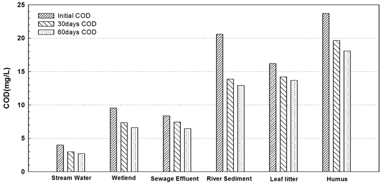 생분해 전 COD 농도는 생분해 후 하천수의 경우 초기 COD 보다 32% 감소하였으며, 습지는 30%, 환경기초시설 방류수는 23%, 퇴적토 37%,