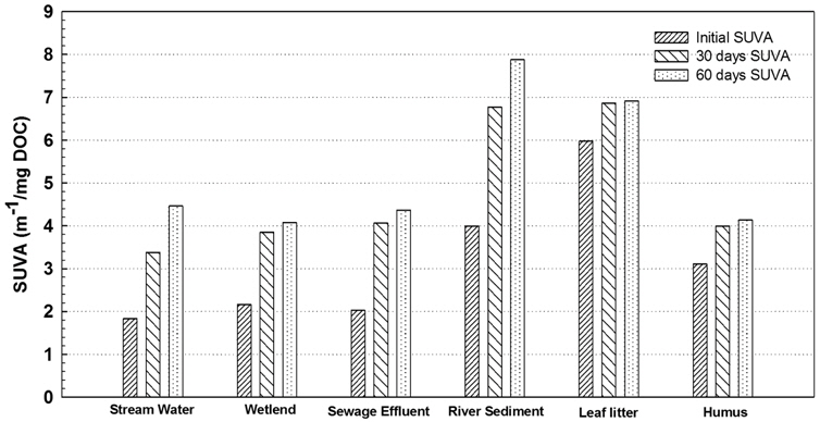 생분해 30일과 60일 후 유기물 시료에 대한 SUVA 값을 비교한 결과 유기물 초기의 SUVA 값은 방류수 2.030 m−1/mg DOC, 퇴적토 3.996 m−1/mg DOC, 낙엽 5.957 m−1/mg DOC, 부식질 3.112 m−1/mg DOC 이었으나 생분해 30일 후에는 방류수 4.064 m−1/mg DOC, 퇴적토 6.772 m−1/mg DOC, 낙엽 6.864 m−1/mg DOC, 부식질 3.998 m−1/mg DOC 으로 증가하였으며, 60일 후에는 방류수 4.367 m−1/mg DOC, 퇴적토 7.867 m−1/mg DOC, 낙엽 6.912 m−1/mg DOC, 부식질 4.137 m−1/mg DOC로 나타났다. 이는 생분해 기간 동안 유기물의 친수성 성분이 선택적으로 분해되면서 친수성 성분이 감소하고 소수성 성분이 상대적으로 증가하였음을