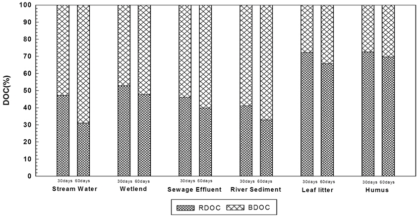 DOM 중 생분해 성분(biodegradable DOC, BDOC)은 종속영양 박테리아에 의해 무기화(mineralization)되는 DOC의 한