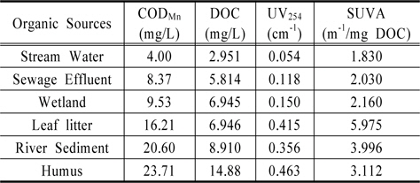 살펴보기 위하여 하천수, 환경기초시설 방류수, 습지, 하천퇴적토와 같이 유기물의 기원에 따른 시료를 준비하여 기원별 DOM의 성상변화 특성을 비교·조사하였다.