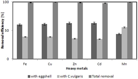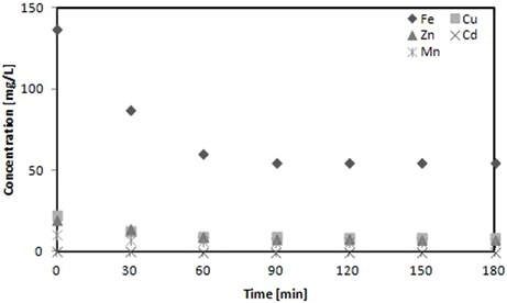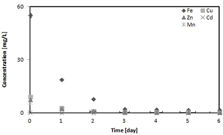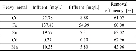하였다. 실험결과 60.00% Fe, 61.02% Cu, 63.02% Zn, 43.96% Mn 그리고 62.96% Cd 제거율을 나타내었다(Table 2). Fe, Cu, Zn 그리고 Cd은 60% 이상의 제거율을 나타내었으나 Mn은 44%의 제거율을 나타내어 다른 중금속에 비해 상대적으로 낮은 제거율을