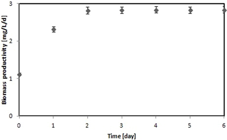 2.52배 증가하였음을 알 수 있었다. C. vulgaris 는 3일째까지는 지속적으로 생산량이 증가하였으나 3일째부터는 둔화되어 4일부터 6일까지는 각각 2.83 g/L/d, 2.84 g/L/d 그리고 2.83