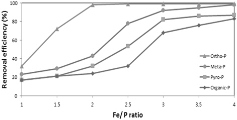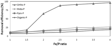 경우 Fe/P의 몰비 2, 2.5, 3 이상에서 급격한 제거율의 상승이 나타나 Fe/P의 몰비 4에서 메타인(95%) > 피로인(82%) > 유기인(78%)의