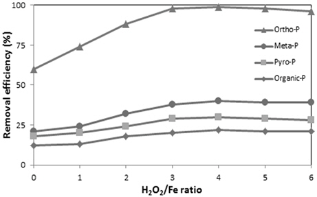 Effect of H2O2/Fe mole ratio on phosphorus removal efficiency with Fe/P molal ratio of 2.