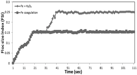 철 응집만을 수행한 경우에는 응집 플럭의 크기는 초기에 증가한 후 약 20초 후에는 정상상태에 도달하여 FSI의 값이 0.15로 일정하게 유지되는