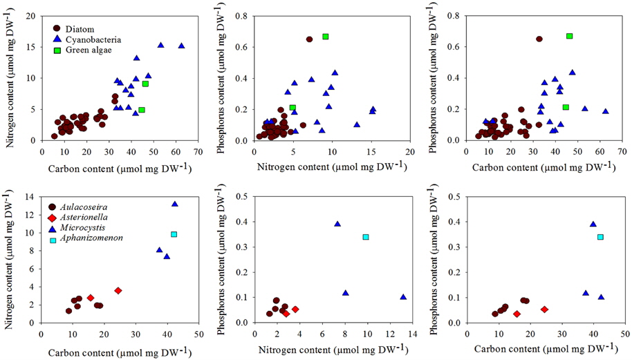 단일 속이 90% 이상 우점했던 시료에서는 이런 물질함량 특성이 더욱 뚜렷이 나타나 규조류인 Asterionella 속과 Aulacoseira 속은 남조류인 Microcystis 속과 Aphanizomenon 속에 비해 확연히 낮은 탄소와 질소 함량을 보였다. 인 함량의 경우 동일한 Microcystis 속 내에서도 상당한 차이를 보였고 전체 남조류 우점 시료(16건)의 평균 인 함량(0.218±0.122μmol P mg DW−1)에 비해 높거나 낮았는데 Microcystis 우점 시료 3건 중 인 함량이 높았던 시료 1건과 Aphanizomenon 시료 1건은 수중 총인농도가 매우 높은 팔당호 경안천 수역에서 채취한 시료이며, 인 함량이 낮은 Microcystis 속 우점 시료 2건은 모두 수중 총인농도가 낮은 충주호에서 채취한 시료이다. 따라서 남조류가 규조류에 비해 대체로 인 함량이 높지만 남조류 내에서는