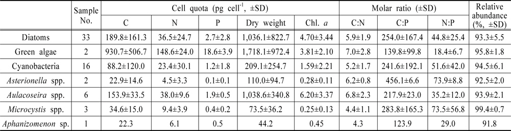 본 연구에서 조사된 시료 중에서 단일 분류군이 80% 이상, 단일 속이 90% 이상 우점한 시료를 대상으로 세포당 물질함량 및 클로로필 a 함량, C:N:P 비를 계산한 결과, 분류군에 따라 세포당 물질 함량(cell quota)은 차이를 보였으며 세포크기가 큰 규조류와 녹조류의 물질