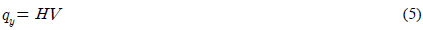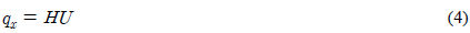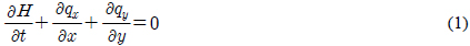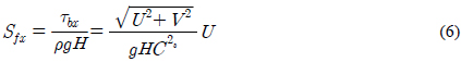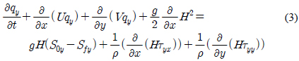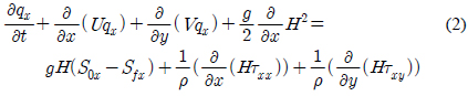 ์ฌ๊ธฐ์, H๋ ํ๋ฆ์ ํ๊ท ์์ฌ, U์ V๋ ๊ฐ๊ฐ x์ y๋ฐฉํฅ์ ์์ฌํ๊ท ์ ์, g๋ ์ค๋ ฅ๊ฐ์๋, ฯ๋ ๋ฌผ์ ๋ฐ๋, S0x์ S0y๋ x์ y๋ฐฉํฅ์ ํ์๊ฒฝ์ฌ, Sfx์ Sfy๋ ๊ฐ๊ฐ x์ y๋ฐฉํฅ์ ๋ง์ฐฐ๊ฒฝ์ฌ์ด๋ค. ๊ทธ๋ฆฌ๊ณ ฯxx,ฯxy,ฯyx์ ฯyy๋ ์ํ์๋ ฅ ์ธ์๋ฅผ ๋ํ๋ธ๋ค(Lee et al., 2012). ๋ฐ๋ฅ๋ฉด ์ ๋จ ์๋ ฅ์ ์ํฅ์ ๋ฐ๋ x ๋ฐฉํฅ์ ๋ง์ฐฐ๊ฒฝ์ฌ๋ ๋ค์ ์๊ณผ ๊ฐ์ด ์์ฌ ํ๊ท ๋ ์ ์์ ํจ์๋ก ๊ฐ์ ํ๋ค.