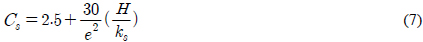 ์ฌ๊ธฐ์, ฯbx๋ x๋ฐฉํฅ์ผ๋ก์ ๋ฐ๋ฅ๋ฉด ์ ๋จ์๋ ฅ์ด๊ณ Cs๋ Chezy ๊ณ์์ด๋ค. Chezy ๊ณ์๋ ์ (7)๊ณผ ๊ฐ์ด ๋ฑ๊ฐ์กฐ๊ณ (Roughness height) ks์ ์์ฌ์ ํจ์๋ก ํํํ ์ ์๋ค.