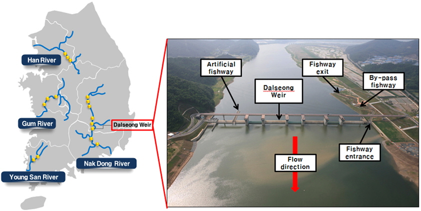 View location and aerial view of Dalseong Weir in Nakdong River.
