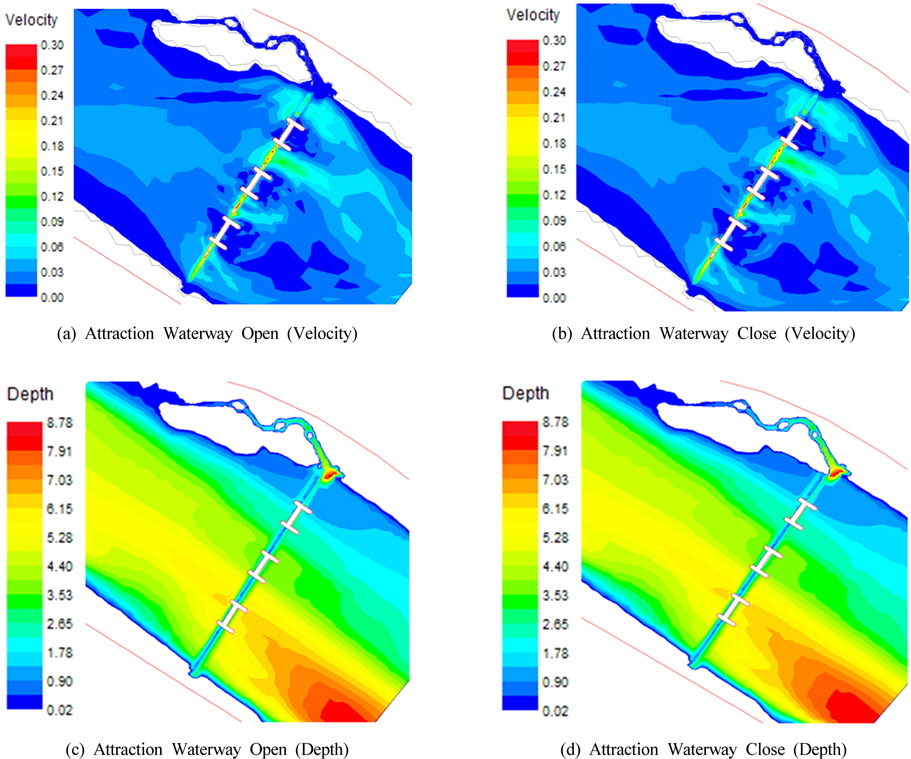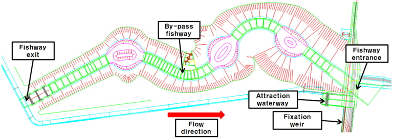 Attraction efficiency, Attraction waterway, By-pass fishway, Dalseong weir, River2D