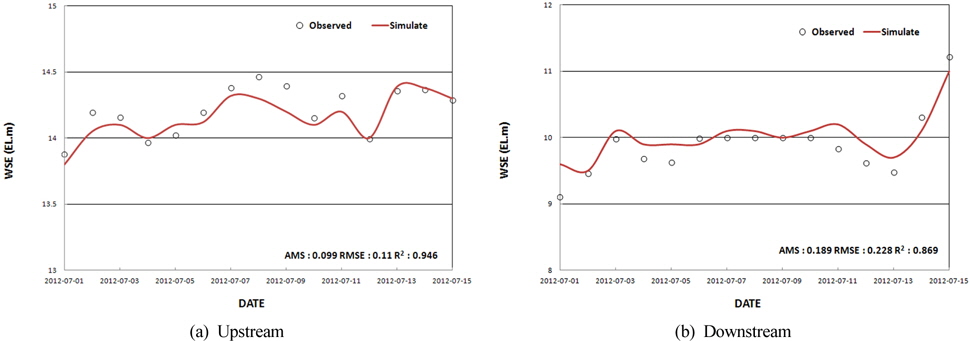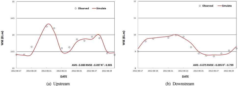 System)์์ ์ ๊ณตํ๋ ์ค์ธก ์์ ์๋ฃ์ ์์-์ ๋๊ด๊ณ๊ณก์ ์์ ์ด์ฉํ์ฌ ์ ๋์ ์ฐ์ ํ๊ณ ๋ถ์ํ์๋ค(MLTM, 2010). ๊ณ ๋ น๊ต์์ํ๋ ๋ฌ์ฑ๋ณด๋ก๋ถํฐ 3.43 km ์๋ฅ์ ์์นํ๋ฉฐ ํํ์์ํ์ ๊ฒฝ์ฐ ๋ฌ์ฑ๋ณด๋ก๋ถํฐ 4.13 km ํ๋ฅ์ ์์นํ๊ณ ์๋ค. Fig. 5๋ ๋๋๊ฐ ๊ณ ๋ น๊ต์์ํ์ ์ ํฉ๊ณก์ ์ด๋ฉฐ, Table 2๋ ๊ณ ๋ น๊ต์์ํ์ ์ ๋๊ณผ ํํ์์ํ์ ์์๋ฅผ ์์ฝํ์ฌ ๋ํ๋ธ ๊ฒ์ด๋ค. ๋ฌ์ฑ๋ณด ์๋ฅ ๊ณ ๋ น๊ต์์ํ์ ์ ๋์ ํ์๊ธฐ 156.84 m3/s, ํ์๊ธฐ 33.22 m3/s, ์ ์๊ธฐ 33.22 m3/s, ๊ฐ์๊ธฐ 30.36 m3/s์ด๊ณ ํ๋ฅ์ ํํ์์ํ์ ์์๋ ํ์๊ธฐ EL. 10.75 m, ํ์๊ธฐ EL. 9.88 m, ์ ์๊ธฐ EL. 9.22 m, ๊ฐ์๊ธฐ EL. 7.70