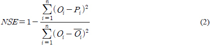 NSE)를 이용하여 평가하였다. R2와 NSE는 1에 가까울수록 모형의 예측치가 실측치를 잘 모의하는 것을 의미한다. NSE 값은 다음의 식 (2)로 표현할 수 있다(Nash and Sutcliffe, 1970).