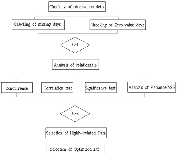 자료의 유의성 검정이 유의수준과 NSE의 임계점(NSE>0.8)에 부합하면 신뢰도가 확보된 것으로 보고 유량측정 자료를 이용하였다(C-2 in Fig. 2). 세 번째는 두 측정지점간의 유량자료의 연관성이 높은 지점을 최적 지점으로 선정하였다.