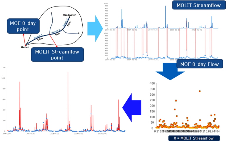 다음 Fig. 3과 같은 방법으로 국토부(Ministry of Land Infrastructure and Transport, MOLIT) 유량 자료와 환경부(Ministry