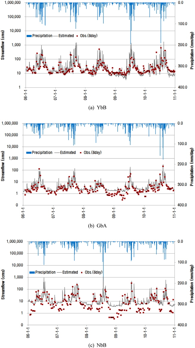 Estimated hydrograph and observed flow data at three unit watersheds (2006-2010).