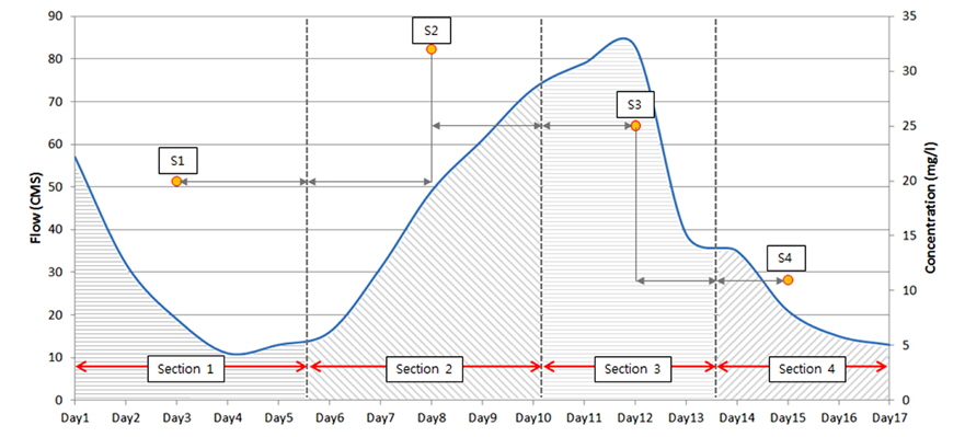 환경부에서 8일 간격으로 측정하고 있는 하천유량 및 수질 자료를 이용하여 하천으로 유입되는 오염부하를 직접유출량, 기저유출량, 그리고 점오염원 방류량으로