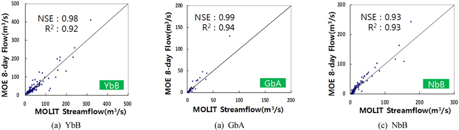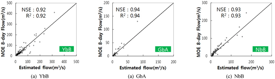 대한 정확성을 파악하기 위해 결정계수(R2)와 유효지수(NSE) 및 분산도를 산정하여 확인하였다.