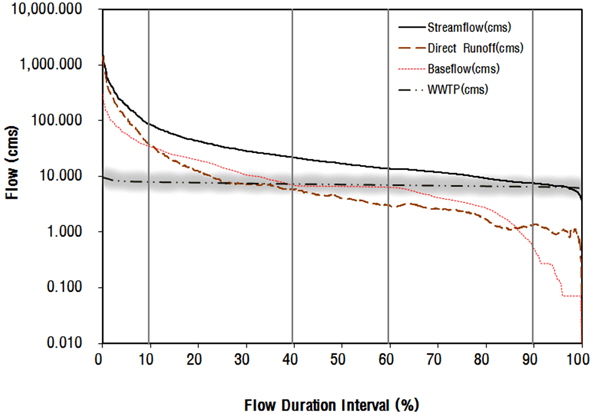 그리고 하천의 유량은 크게 직접유출량 및 기저유출량, 하수처리장 같은 점오염원 방류량으로 하천이 이루어지기 때문에 대도시의 경우 건기 시 하천 유량의