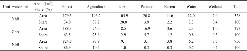 본 연구에서는 낙동강 유역의 Nakbon B (NbB), 영산강 유역의 Yeongbon B (YbB), 금강 유역의 Geumbon A (GbA) 수질오염총량단위유역을