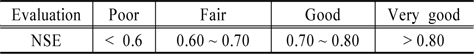 Ramanarayanan et al. (1997) 적용성 평가에서 R2가 0.5 이상이고, NSE가 0.4 이상이면 모형이 자연현상을 잘 모의하는 것으로 제시하였으며 Donigian (2000) 제시한 일반적인 모형의 효율의 범위와 신뢰구간은 Table 2와 같다.