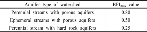 BFLOW 필터는 유역내 대수층 특성을 전혀 고려하지 않는 단점이 있다. 이에 Eckhardt (2005)는 유역 내 대수층 특성을 고려하여 기저유출을 분리하는 모듈을 제안하였고, 기저유출 분리시 사용되는 BFImax (Base Flow Index Max) 값 산정에 있어 주관적인 요소를 배제하기 위하여 대표 대수층 별로 BFImax 값을 제안하였다(Table 3).
