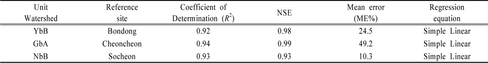 본 연구에서는 확장하여 산정된 일일유량 자료에 대해서 결과의 정확성을 평가하기 위해 결정계수(R2)를 분석하였다. 또한 결과의 정확성을 판가름하기 위해서 유효지수(Nash-sutcliffe model efficiency coefficient: