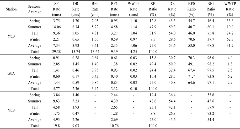 상당부분이 하수처리장의 방류량이 차지하기 때문에 기저유출량 산정 시 고려하여야 한다. 이를 위해 YbB와 GbA 유역에 있는 5년간 (2006~2010년)의