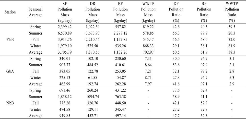 산정하였다. 세 번째는 이를 바탕으로 하천 오염부하 중 직접유출량 오염부하를 제외한 나머지 오염부하 중에서 하수처리장 방류량 및 기저유출량 오염부하를