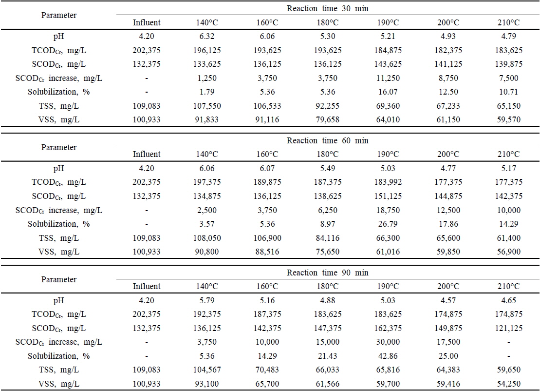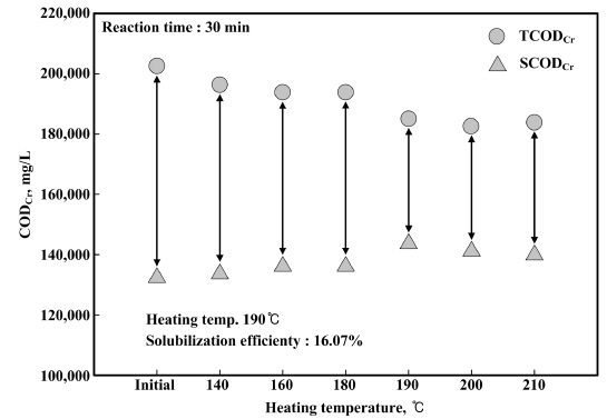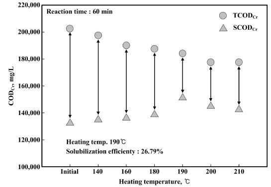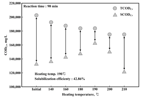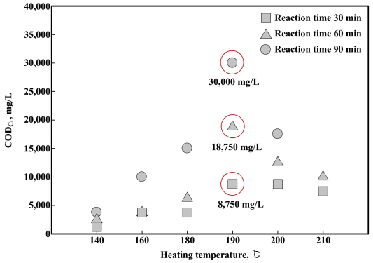 60 및 90 min 동안 열가용화 장치를 운전한 결과 SCODCr의 농도는 140~210°C 온도에서 2,500, 3,750, 6,250, 18,750, 12,500 및 10,000 mg/L와 3,750, 10,000,
