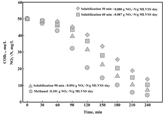 메탄올을 이용하여 반응시간에 따른 NO3--N 농도 변화를 확인한 결과 초기농도 50 mg/L에서 47.2, 42.8, 32.2, 20.6, 14.5, 10.2 및 5.8 mg/L를 보였으며,
