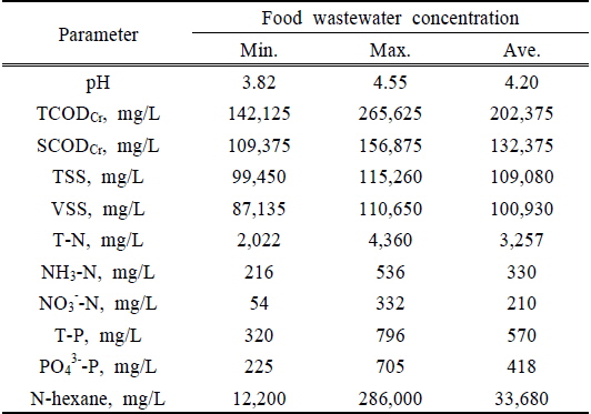때문인 것으로 판단된다. Shin et al. (2007)의 연구에서 음식물 탈수여액의 경우 음식폐기물 조성에서 오는 원인뿐만 아니라 수거함에서 체류하는 시간과 보관조건 등 외부환경조건에 의해 수질변화가