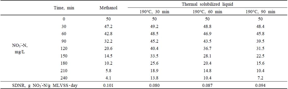 SDNR 결과를 도출한 결과 메탄올은 0.101 g NO3--N/g MLVSS・day을 보였으며, 190°C 조건에서 90 min, 60 min, 및 30 min 전처리를 거친 열가용화액의 경우에는 각각 0.094,