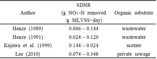 정도를 나타내고 3°C 정도의 수온에서 탈질소화 속도가 정지한다고 보고하고 있다. 따라서 열가용화액을 이용한 생물학적 탈질공정에서 도출된 설계값은