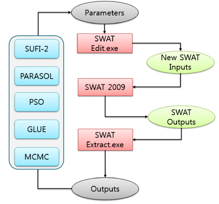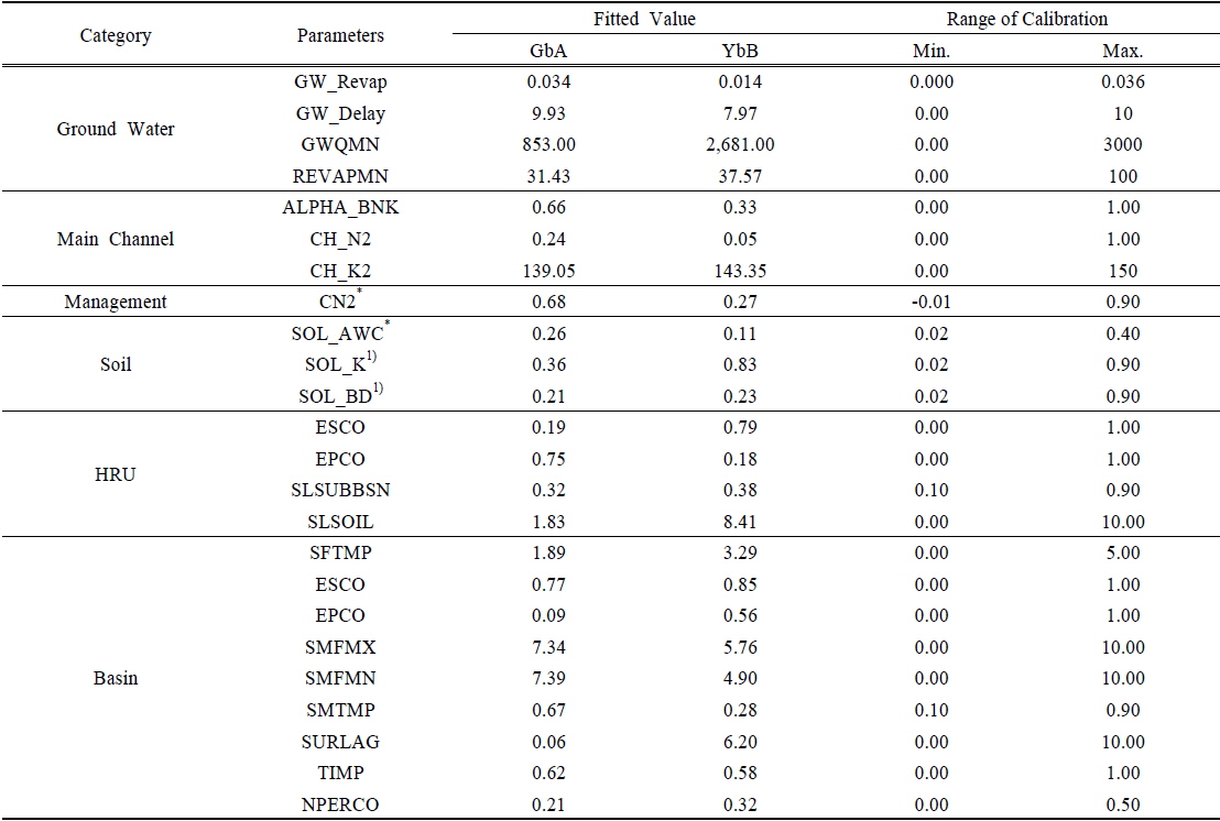 ์๋ ๋ณด์ ์ SUFI-2 ์๊ณ ๋ฆฌ์ฆ์ ์ด์ฉ SWAT๋ชจํ์ ์ ๋์ ๊ดํ ๋งค๊ฐ๋ณ์๋ฅผ SWAT-CUP ๋ด ์ ์ฉํ๊ธฐ ์ํด ์ด 24๊ฐ์ ๋งค๊ฐ๋ณ์๋ฅผ ์ ์ ํ์ฌ ๋ณด์ ํ์๋ค.