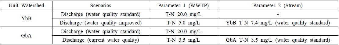 YbB ๋ฐ GbA ์ ์ญ์ ํ์ฒ T-N ๊ธฐ์ค์์ง์ ๊ฐ๊ฐ 7.4 mg/L, 3.5 mg/L๋ก ์ค์ ํ์๋ค. ๊ทธ๋ฆฌ๊ณ ํ์๋(0~10%), ํ์๋(10~40%),