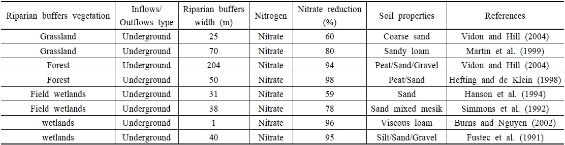 Nitrate reduction with respect to width of riparian buffers in previous studies